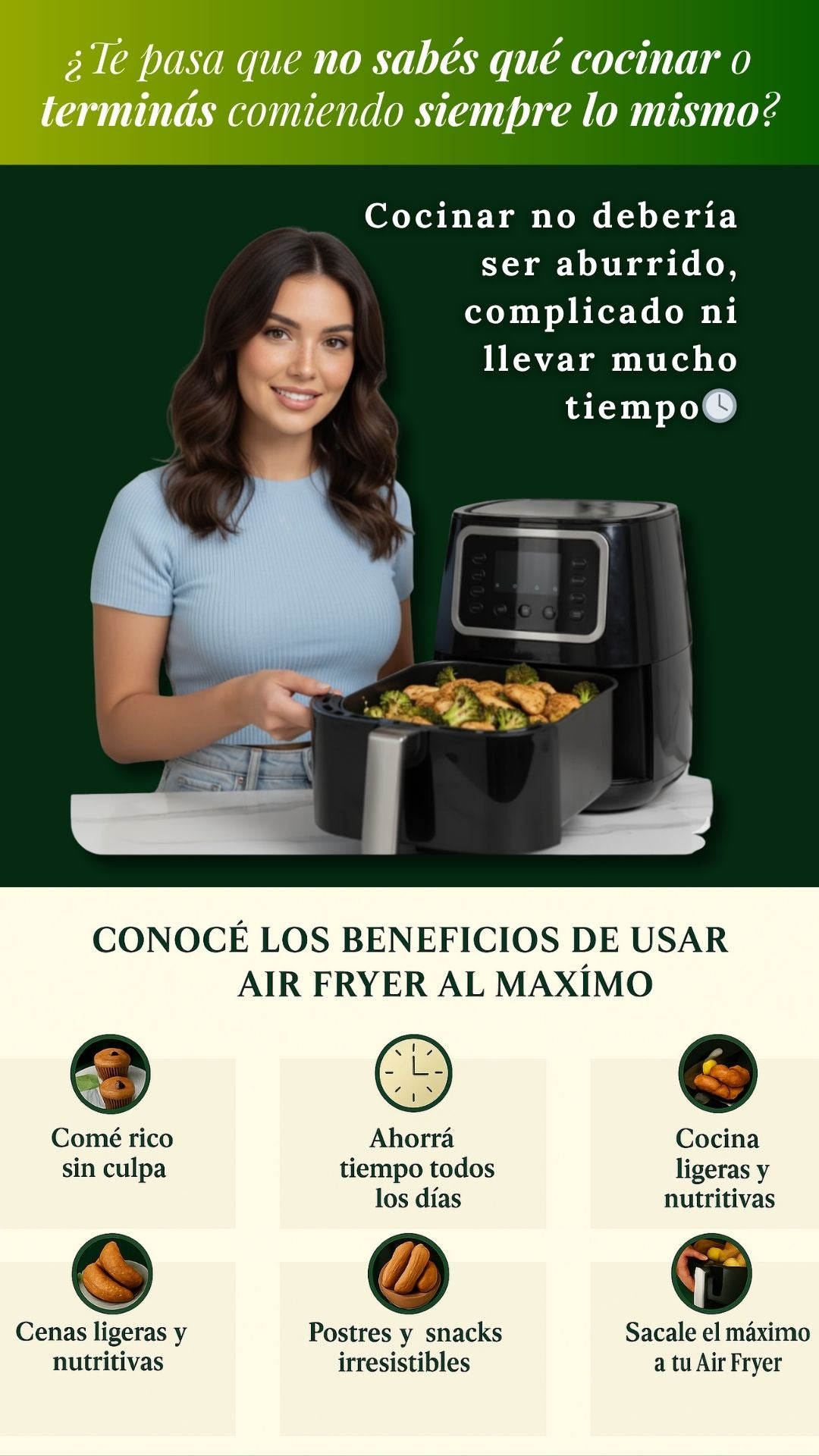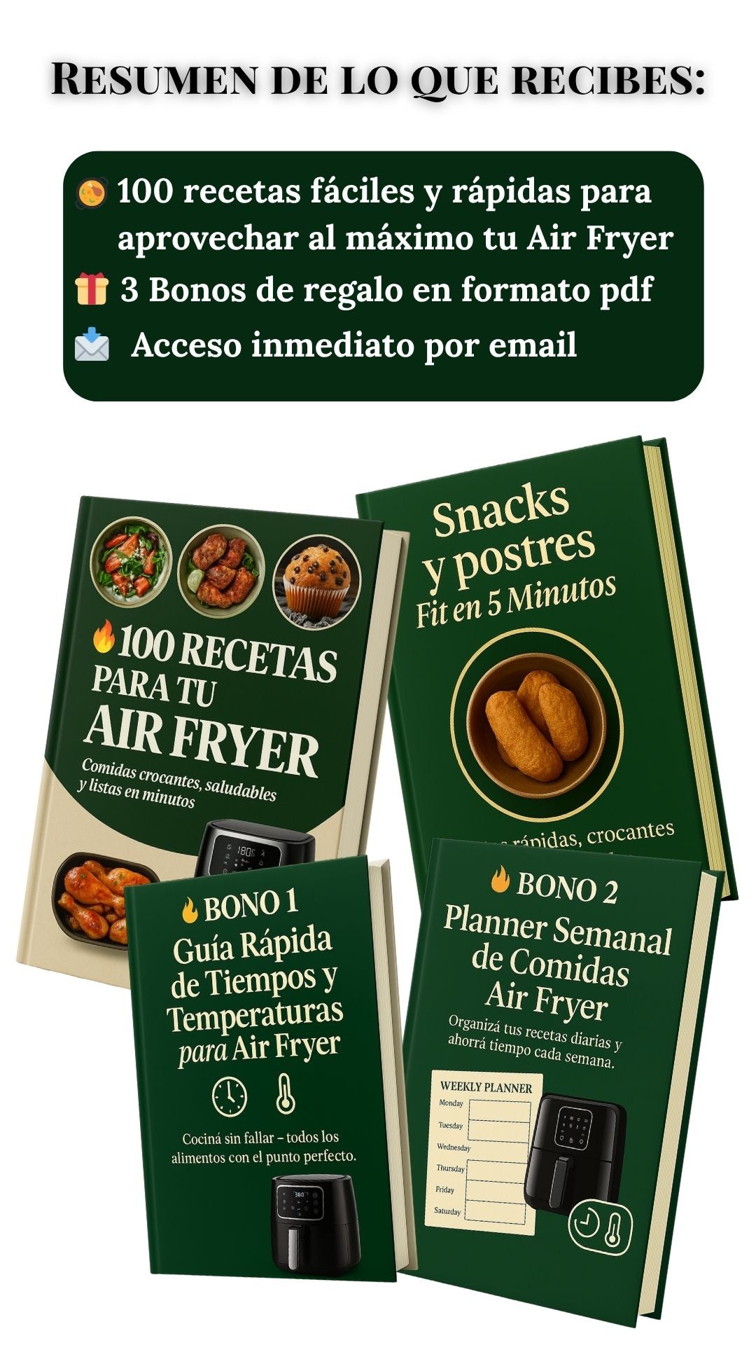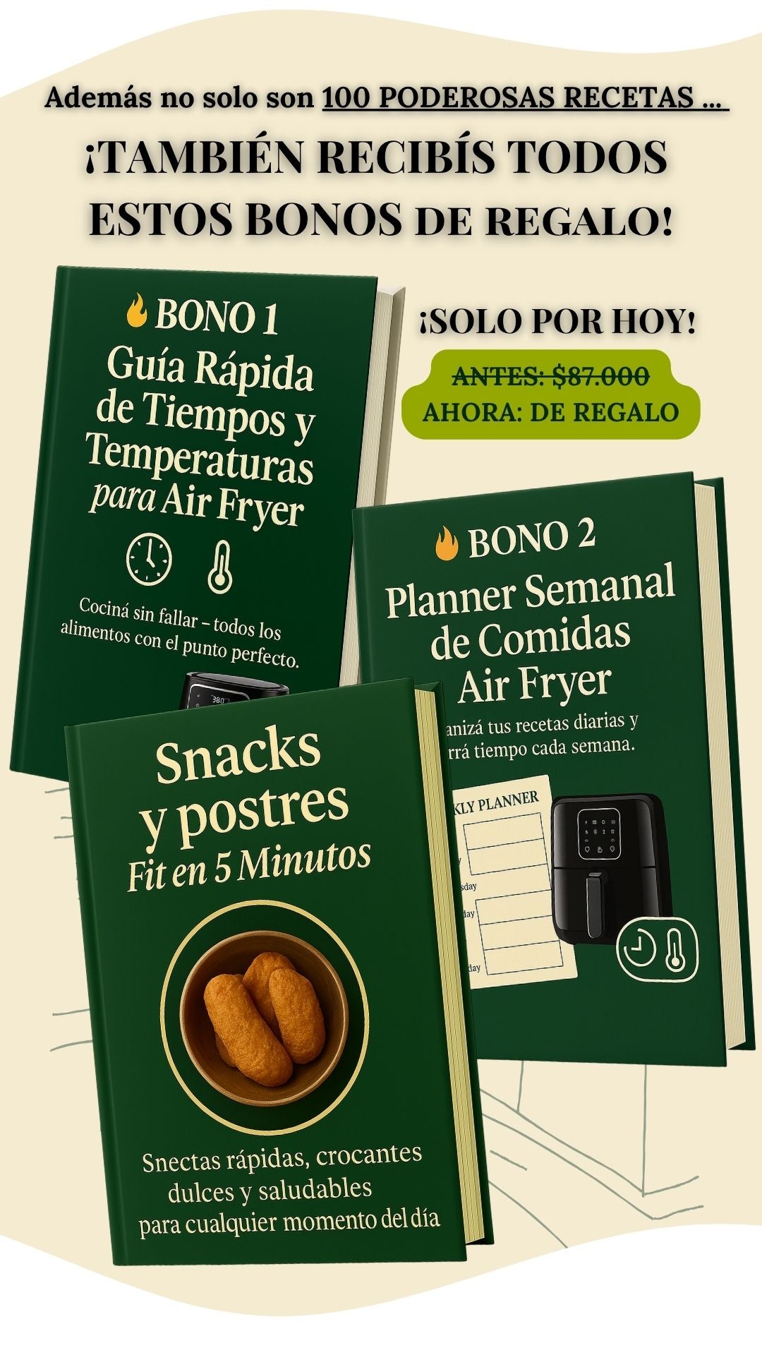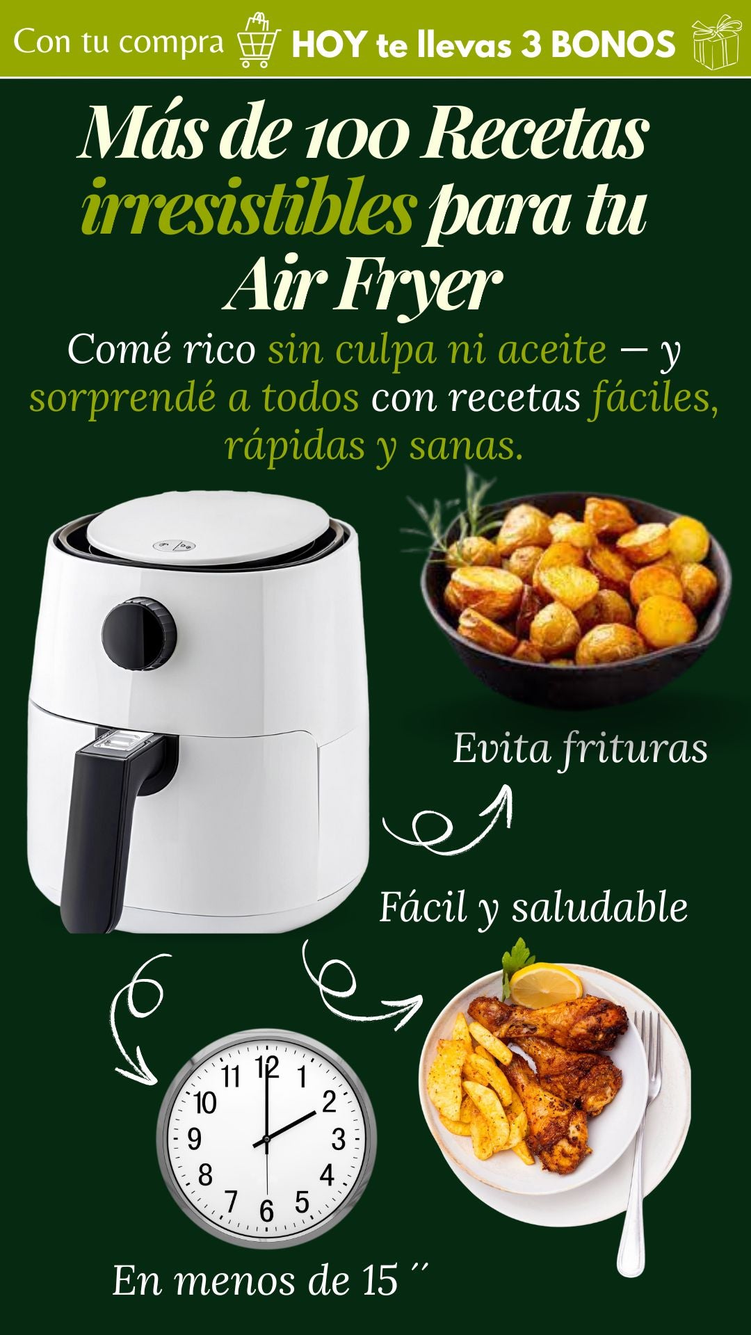 El ebook “100 Recetas para tu Air Fryer” + 3 bonos en PDF: Guía de Tiempos y Temperaturas,